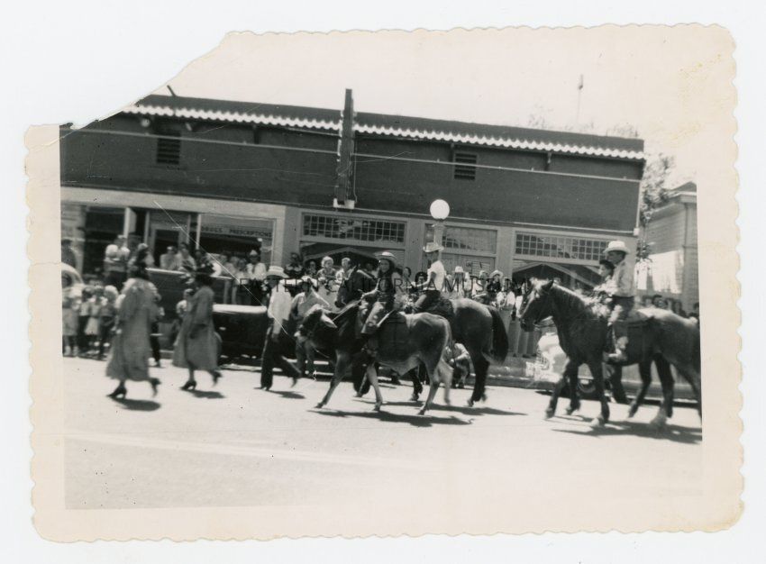 Photo of the 1965 Lone Pine Stampede Parade going down Main Street in Lone Pine. This photo shows several people on horseback and a young girl riding a cow. Top left corner is torn off.Collection
