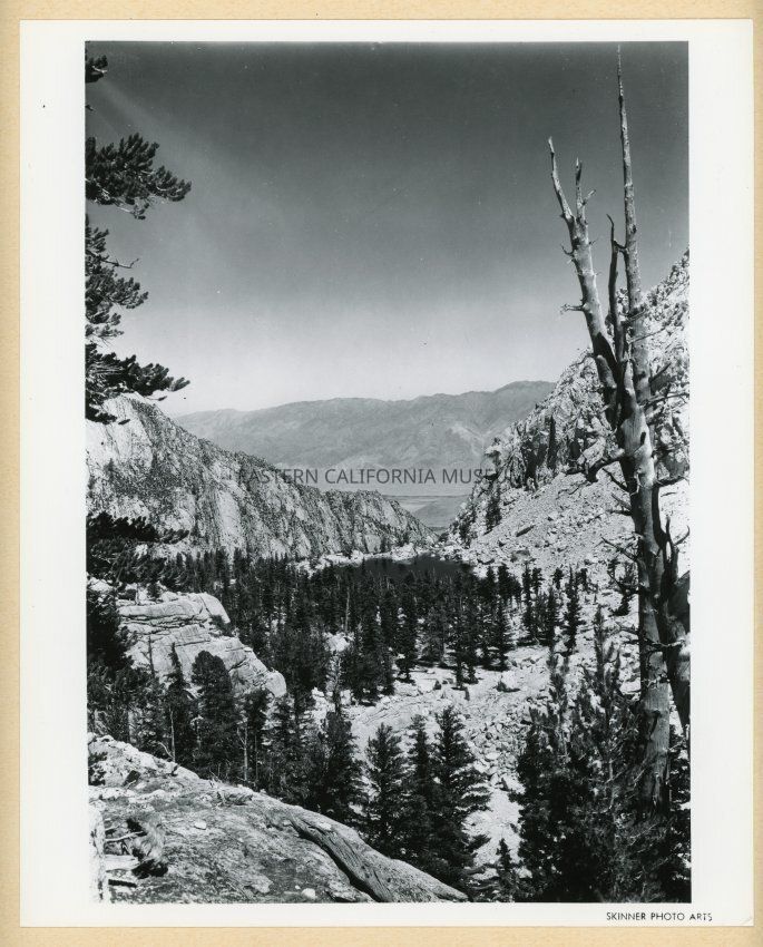 Black and white photo of what may be the view down Lone Pine Canyon, based on the location of the other photos in this album. Taken in the Sierra Nevada looking east toward the Inyo Mountain range. Stamped with "Skinner Photo Arts" in the lower right corner.