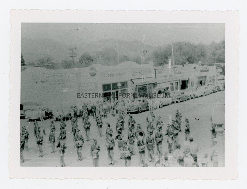 Photo taken from a high vantage point (on top of a building) of a parade going down Main Street in Lone Pine. This photo shows a marching band. The Rogers Market, J. C. Penney Company, and Spanish Garden Cafe are visible across the street.Collection