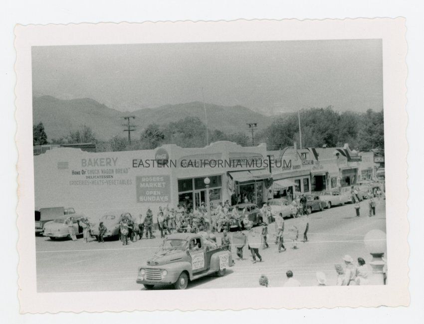 Photo taken from a high vantage point (on top of a building) of a parade going down Main Street in Lone Pine. This photo shows the Cub Scouts of America Troop walking behind a pickup truck. Roger's Market, J. C. Penney Company, and Spanish Garden Cafe are visible on the other side of the street.Collection