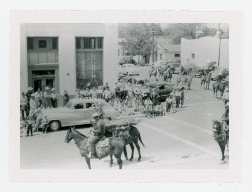 Photo taken from a high vantage point (on top of a building) of a parade going down Main Street in Lone Pine. This photo shows a long line of horseback riders, and the one in the center foreground is leading a mule with a stretcher on its back. Bank of America is visible across the street.Collection