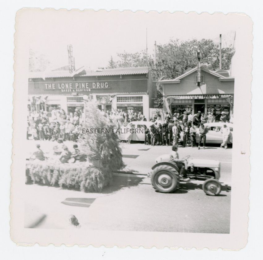 Photo taken from a high vantage point (on top of a building) of the 1953 Lone Pine Stampede parade down Main Street in Lone Pine. This photo shows a tractor hauling a float decorated with tree branches and has some people sitting on it. The Lone Pine Drugstore and a shoe repair shop are visible across the street.Collection