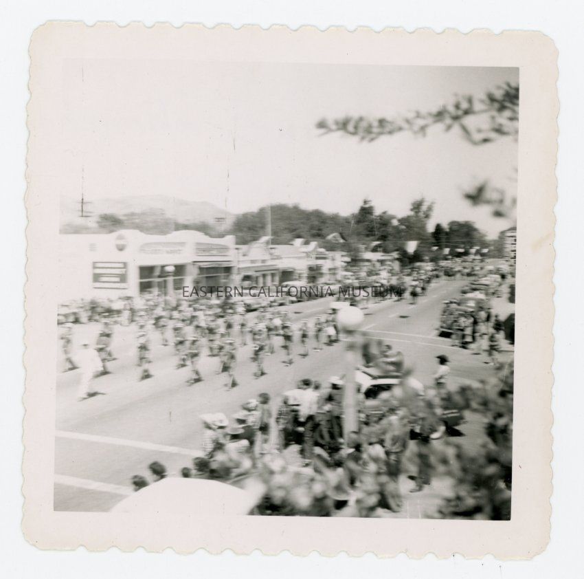 Photo taken from a high vantage point (on top of a building) of the 1953 Lone Pine Stampede parade down Main Street in Lone Pine. This photo shows a marching band. Photo is a little blurry, so the store signs are not legible.Collection