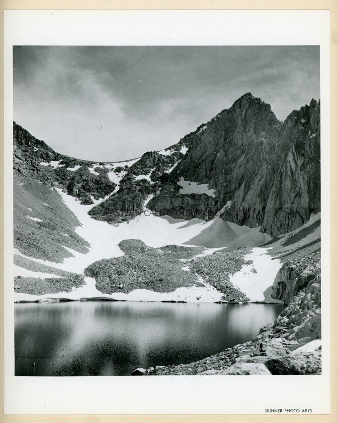 Black and white photo of a lake with snow and mountains. Stamped with "Skinner Photo Arts" in the lower right corner.