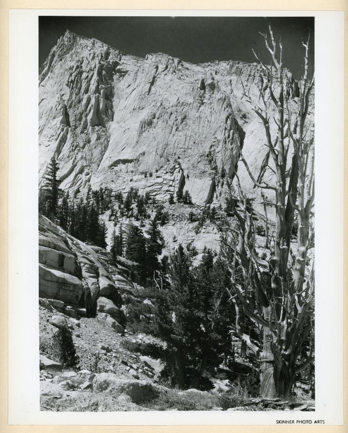 Black and white photo of a mountainside and dead tree in the foreground. Stamped with "Skinner Photo Arts" in the lower right corner.