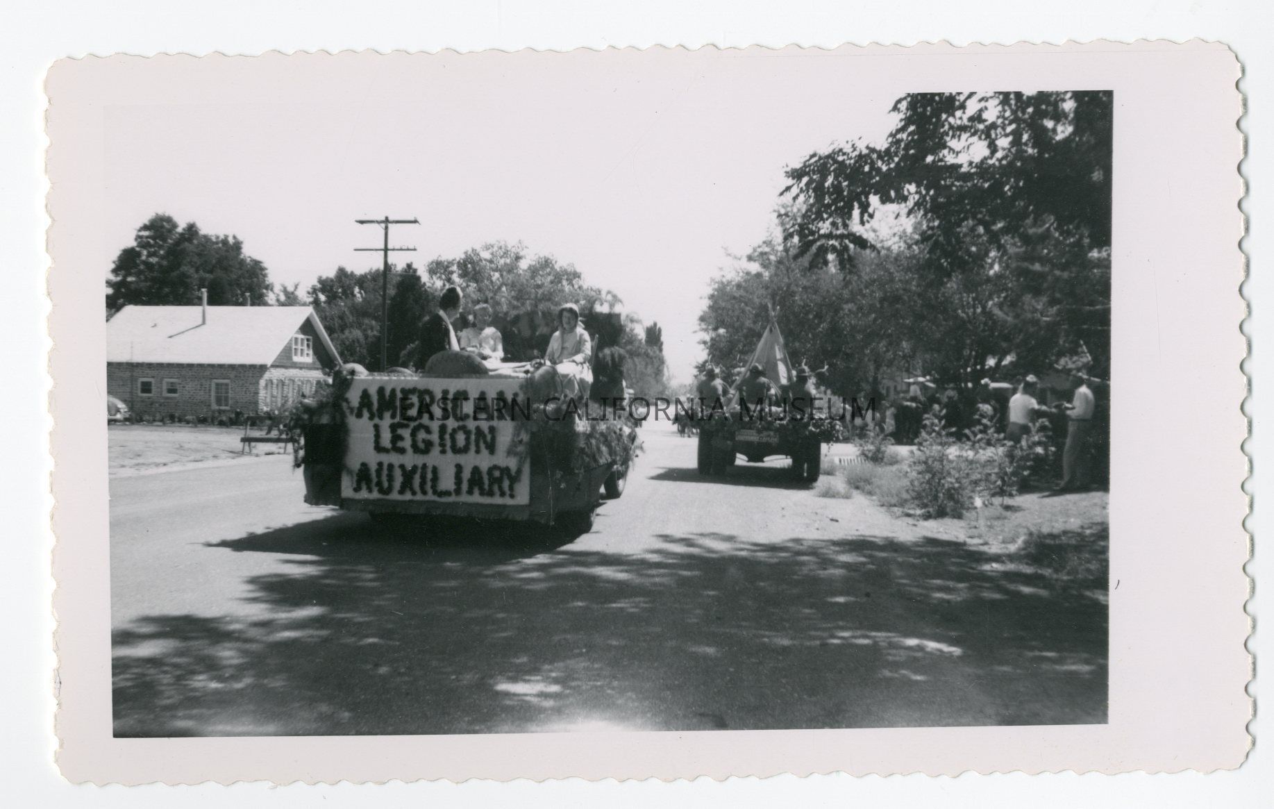 Photo of the American Legion Auxiliary float and one other float (with a teepee?). They are likely waiting to participate in the 4th of July Parade in Independence in 1950.Photograph Details