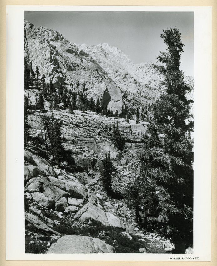 Black and white photo of a trail up the side of a mountain. Stamped with "Skinner Photo Arts" in the lower right corner.