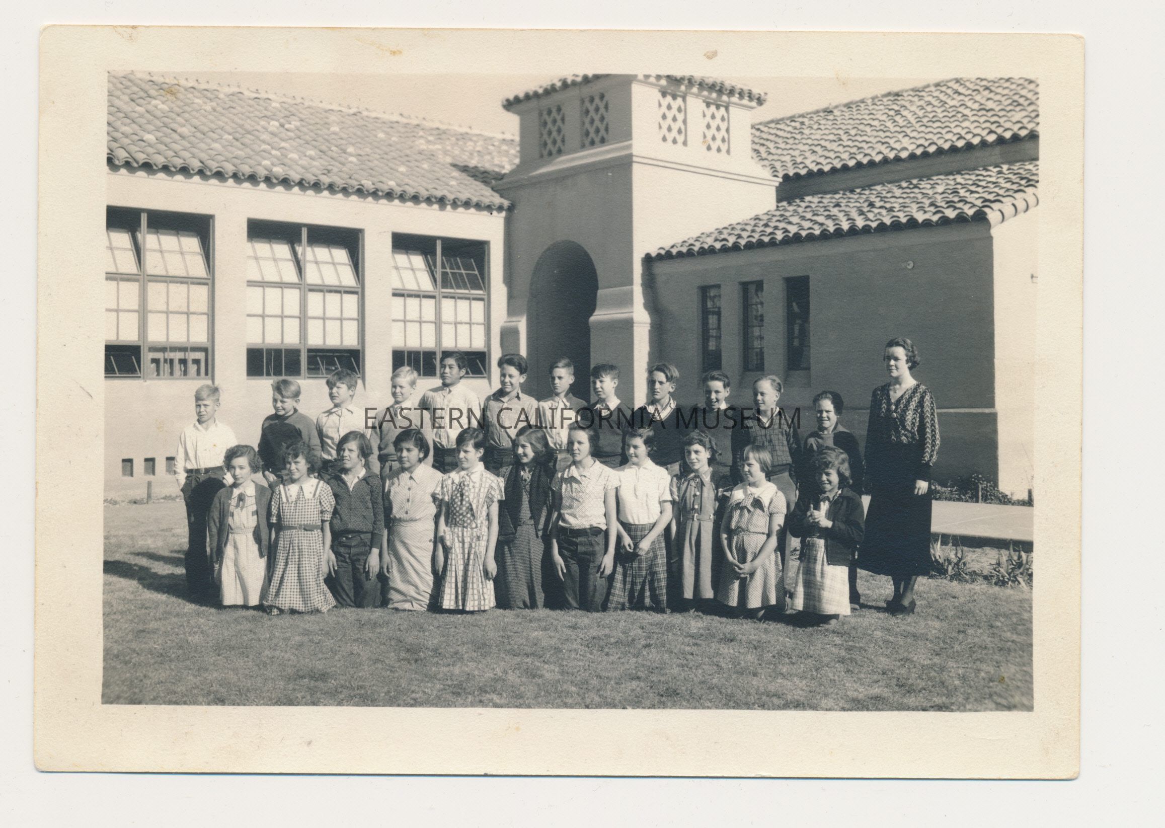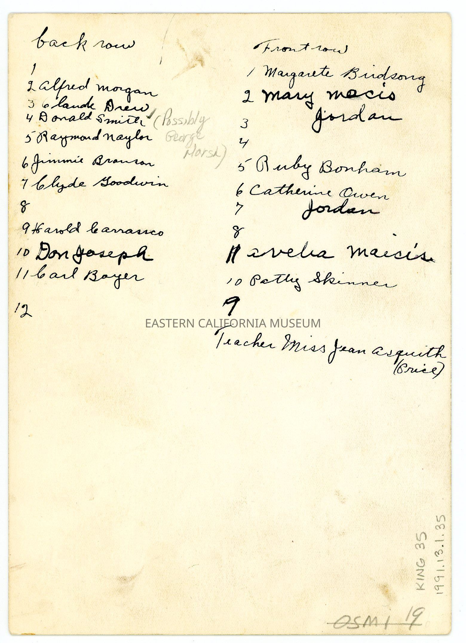 Most of the students are identified on the reverse. Back row LtoR: [unknown], Alfred Morgan, Claude Drew, Donald Smith or George Marsh, Raymond Naylor, Jimmie Branson, Clyde Goodwin, [unknown], Harrold Carrasco, Don Joseph, Carl Boyer, [unknown]. Front row, LtoR: Margarete Birdsong, Mary Maicis, --- Jordan, [unknown], Ruby Bonham, Catherine Owen, --- Jordan, [unknown] Avela Maicis, Patty Skinner, [unknown]. Teacher Miss Jean Asquith (Price).Photograph Details