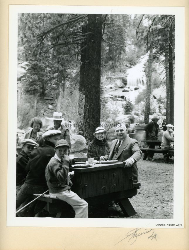 Black and white photo of a group of people eating at a picnic area with a waterfall in the background. The woman in the center is wearing a fur coat. It was taken during the Mt. Whitney Portal Dedication on May 31, 1936. Stamped with "Skinner Photo Arts" in the lower right corner, also autographed in pencil "Skinner LA".