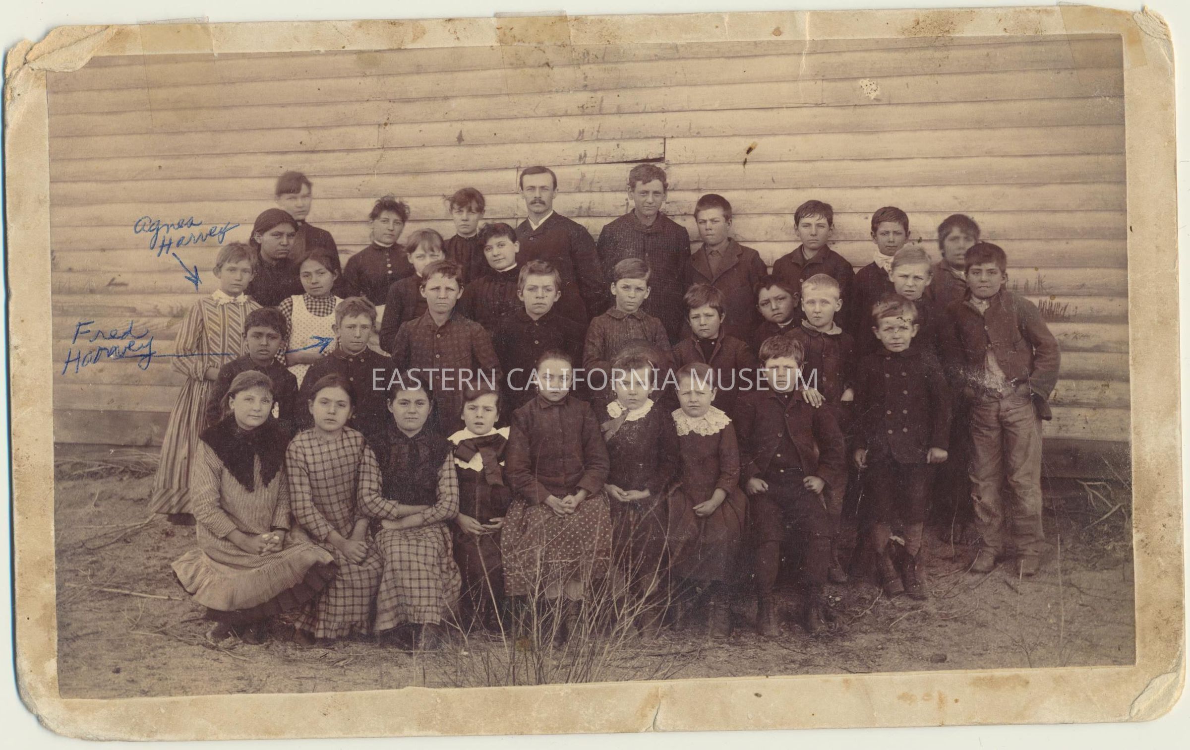 Mounted class or school photo, likely the Lone Pine Elementary School. Two of the children are identified as Agnes Harvey and Fred Harvey. The teacher is unknown.