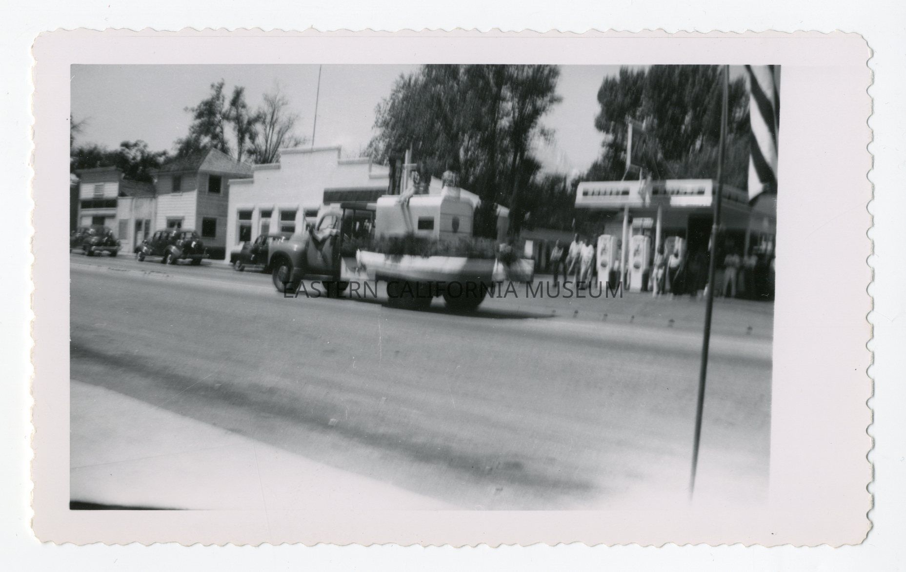 Blurry photo of an automobile float in the 4th of July parade in Independence in 1950.