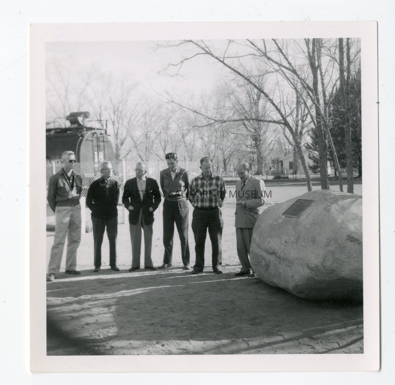 Photo of six men posing next to a large boulder with a metal plaque in it. Engine #18 is in the background in it's home at Dehy Park.