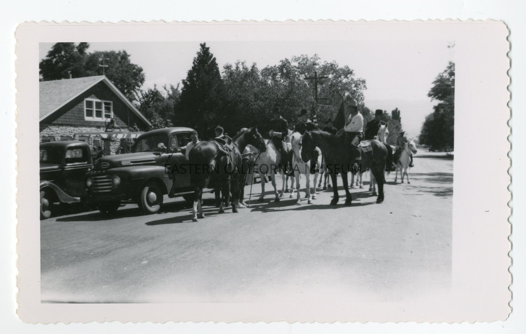 Photo of a group of people mounted on horseback. There are standing around in the middle of a paved road next to two automobiles and a house (stone). They are likely waiting to walk in the 4th of July Parade in Independence in 1950.Photograph Details