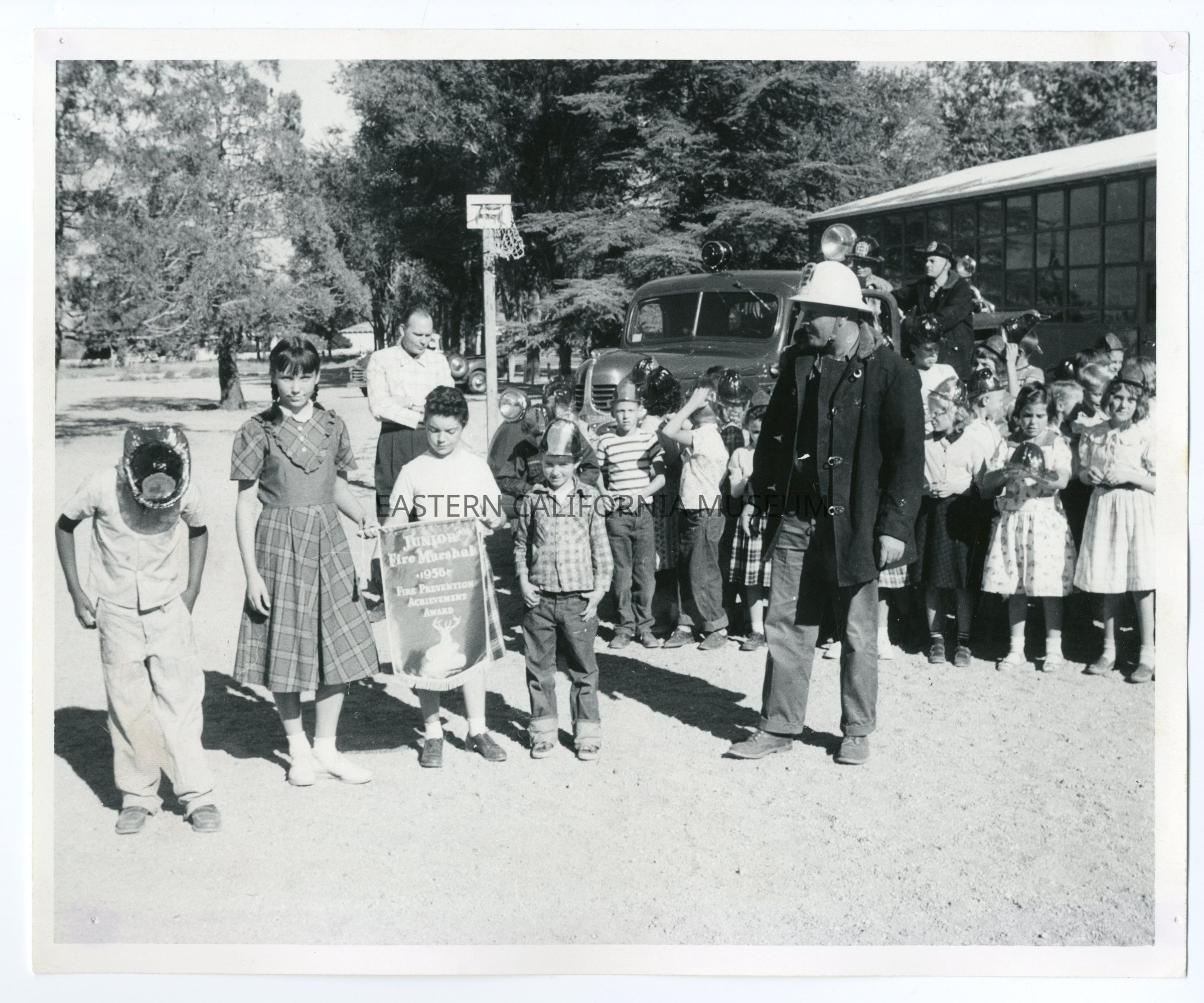 Photo of elementary students at Owens Valley Unified School District in Independence. They are holding a banner that says, "Junior Fire Marshal, 1956 Fire Prevention Achievement Award." A fire truck is parked behind them.Photograph Details