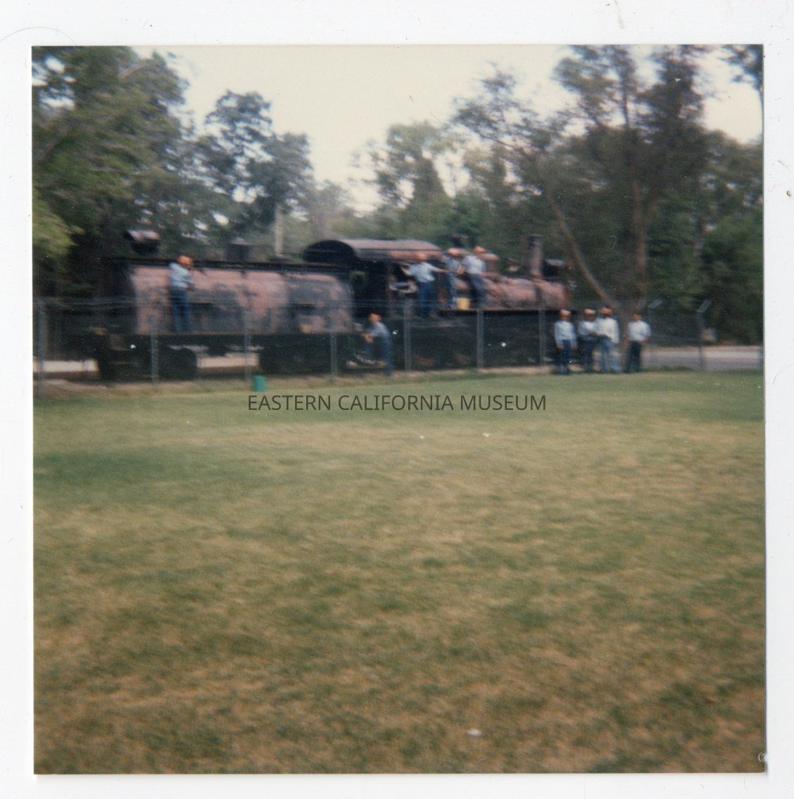 Blurry color photo of nine men cleaning up engine #18 in Dehy Park. The locomotive is badly rusted, and none of the white stenciled letters or numbers are visible.Photograph Details