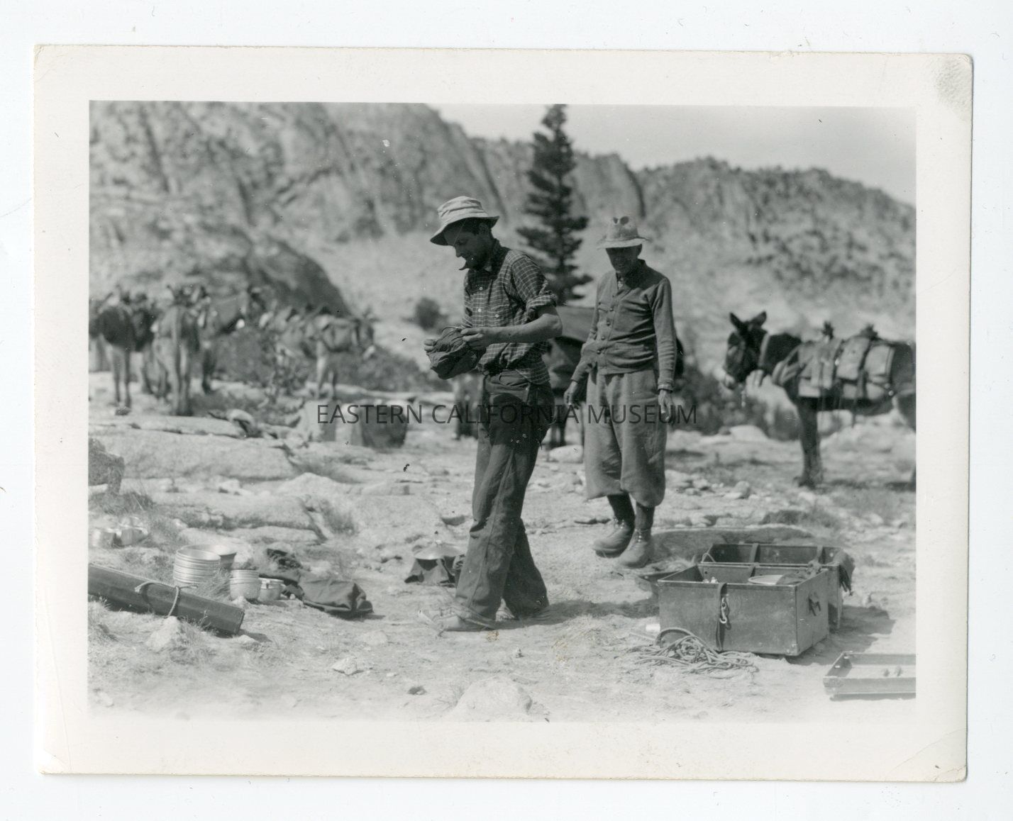Photo of two men in the backcountry with trunk and equipment spread around. There are mules or burros and mountains in the background.