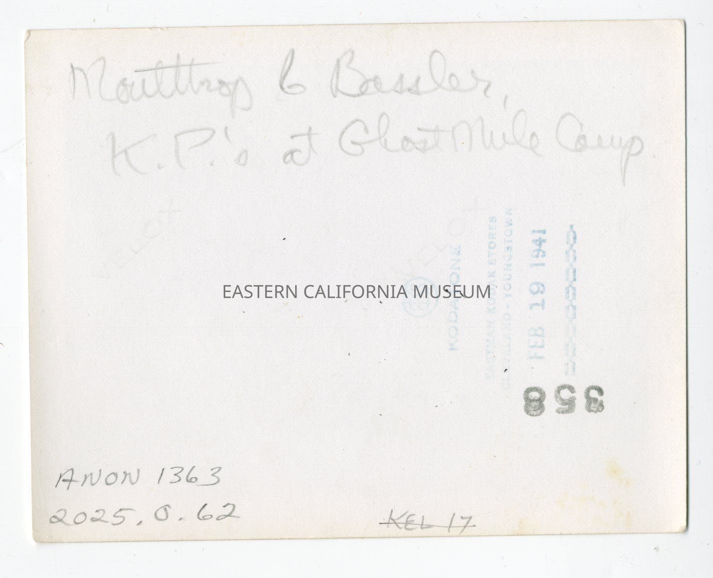 Written in pencil on reverse: Moulthrop and Bassler, K.P.s at Ghost Mule Camp.Photograph Details