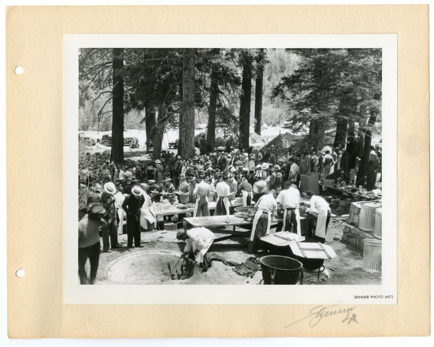 Black and white photo of a large gathering of people. There are tables and people serving food and what appears to be a deep pit oven. It was taken during the Mt. Whitney Portal Dedication on May 31, 1936. Stamped with "Skinner Photo Arts" in the lower right corner, also autographed in pencil "Skinner LA".