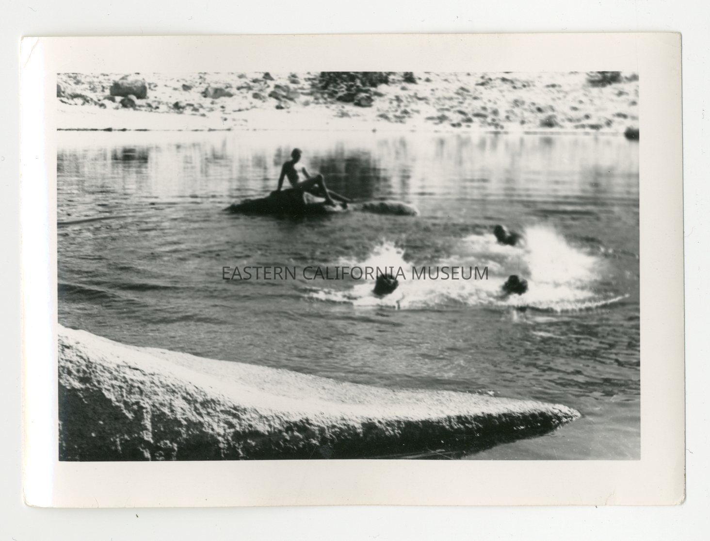 Written in pencil on reverse: Boys swimming in Kearsarge Lakes with fresh snow on the ground. J. Hinkley on the rock. Irvin, S. Inkley, and Jesseman in water. CC.Made/Created