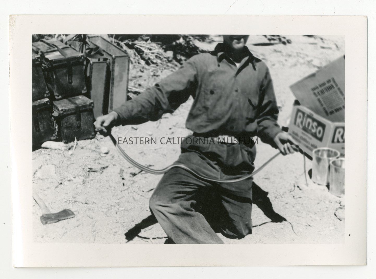 Photo of a man kneeling and holding a snake. His head has been cut off, but it could be Mark Kerr, who was known for catching snakes. There are many trunks and boxes in the background, along with an axe.