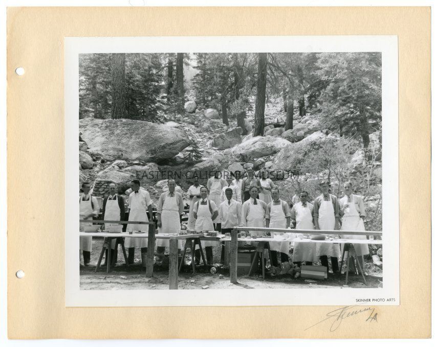 Black and white photo of a group of men wearing aprons in front of serving tables. The man in the center is African American. It was taken during the Mt. Whitney Portal Dedication on May 31, 1936. Stamped with "Skinner Photo Arts" in the lower right corner, also autographed in pencil "Skinner LA".