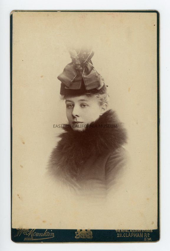 Mounted bust length studio portrait of a woman wearing a fur collar. Photographer was William Mounlain of England and/or the Royal Academy Studios.