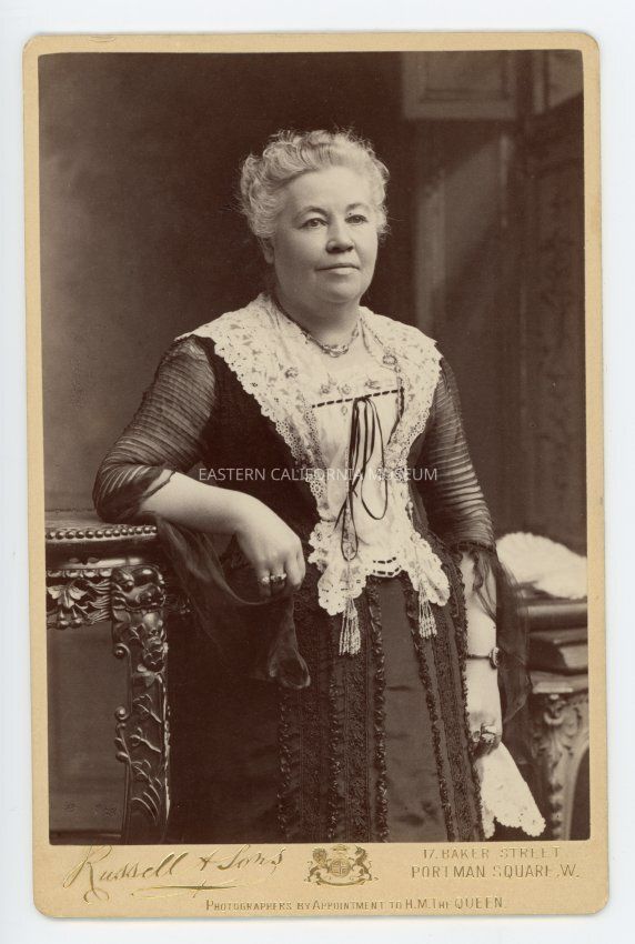 Mounted studio portrait of a woman, likely Edith O'Gorman, resting her elbow on a carved table, 1901. Photographer was J. Russell & Sons of England. Photo or negative #51270D. This photo was loose in the album between pages containing 1985.1.1.2 and 1985.1.1.4.