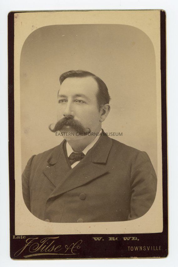 Mounted bust length studio portrait of a man with a curled mustache. Photographer was J. Tilse & Co. of Townsville. Photo is mounted on a black backing and has "Late W. Rowe" in gilt below the photo.