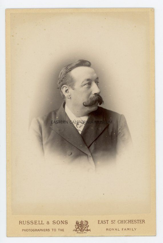 Mounted bust length studio portrait of a man with a horseshoe-shaped tie pin and a large moustache. Photographer was Russell & Sons of East St. Chichester, England. Appears to be the same man in photo 1985.1.1.7, so it may be William Charles Auffrey, the husband of Edith O'Gorman.