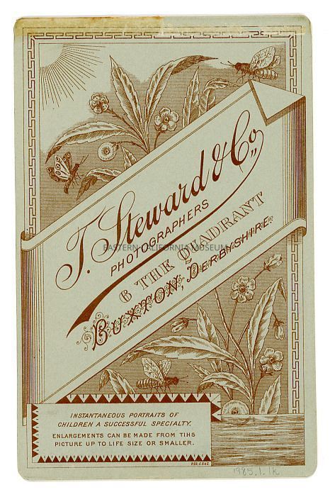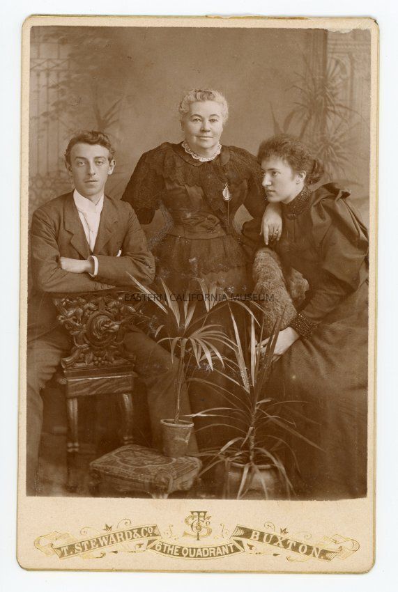 Mounted studio portrait of a woman standing between a seated young man and a seated young woman. The standing woman is likely Edith O'Gorman, and perhaps the young man is her son, William John Charles Auffray? Photographer was T. Steward & Co. of Buxton, England. Signs of editing around the waist of the standing woman to make her appear slimmer. Same photo as 1985.1.1.14.