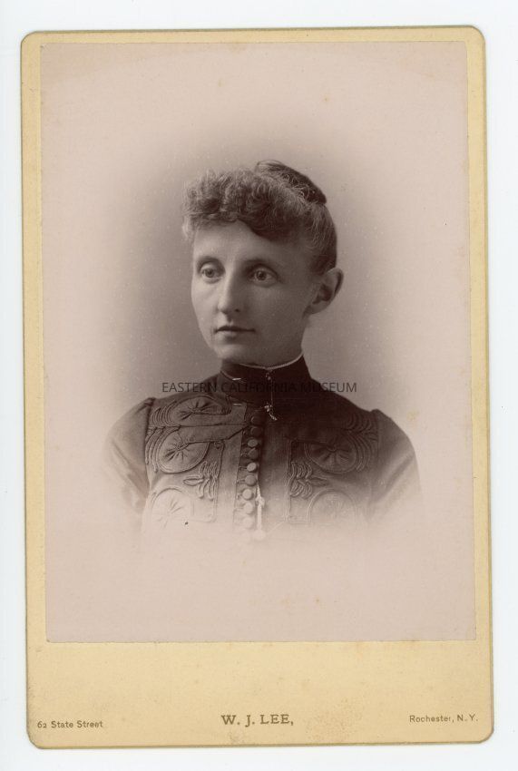 Mounted bust length studio portrait of a woman. Photographer was W. J. Lee of Rochester, NY.
