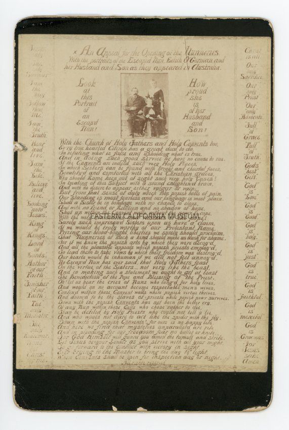 Mounted photo of a religous text with the heading, "An appeal for the opening of the nunneries. With the portraits of the escaped nun Edith O'Gorman and her husband and son as they appeared in Australia." It is followed by a long rhyming poem.
