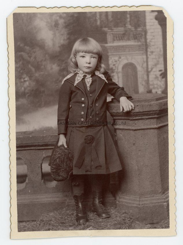 Mounted studio portrait of a young child wearing a skirt and lace collar who is identified as John Gorman Jr. on the album page beneath the picture window. The edges of the mount are scalloped.Collection
