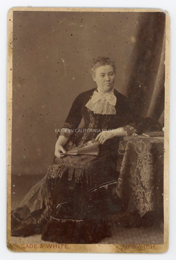 Mounted full length studio portrait of a seated woman, likely Edith O'Gorman, holding a fan in her lap. Photographer is Cade and White of Ipswich, England.