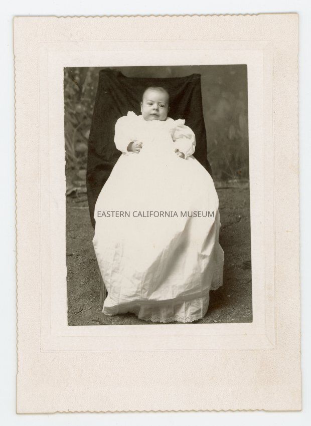 Mounted photograph of a baby in a long white dress. The edges of the mount are scalloped.