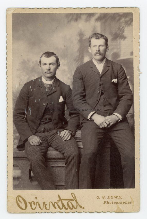 Mounted studio portrait of two men sitting on a balustrade and plinth. Photographer was O. S. Dowe of the Oriental Studio. The mount has scalloped edges.Collection