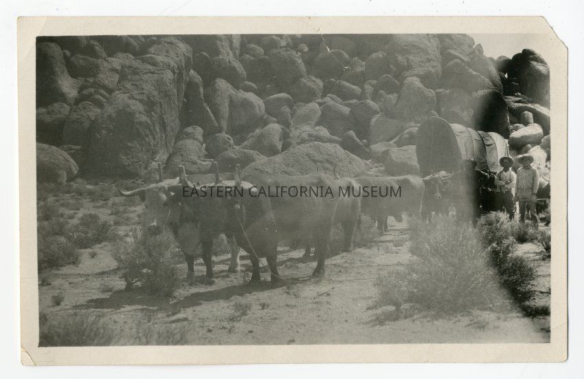 Movie set with oxen pulling a covered wagon. There is some discoloration on the right side of photo.