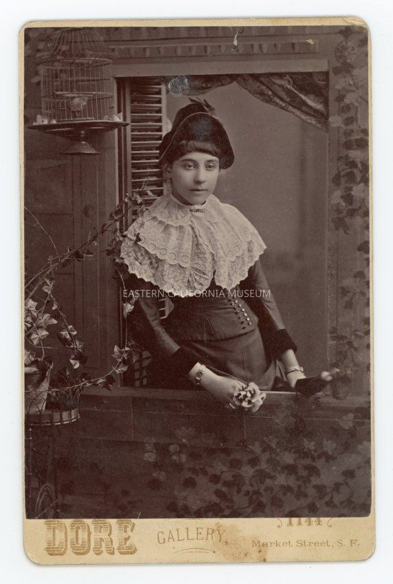Mounted studio portrait of a young woman posing in an elaborate window scene with plants and a birdcage. She is waering a hat and large lace collar while holding a posey of flowers and an umbrella or parasol. Photographer was Dore Gallery of San Francisco or Cobb's Dore Galley, late of Edouart and Cobb.