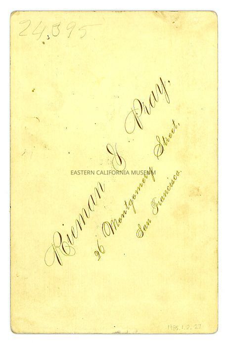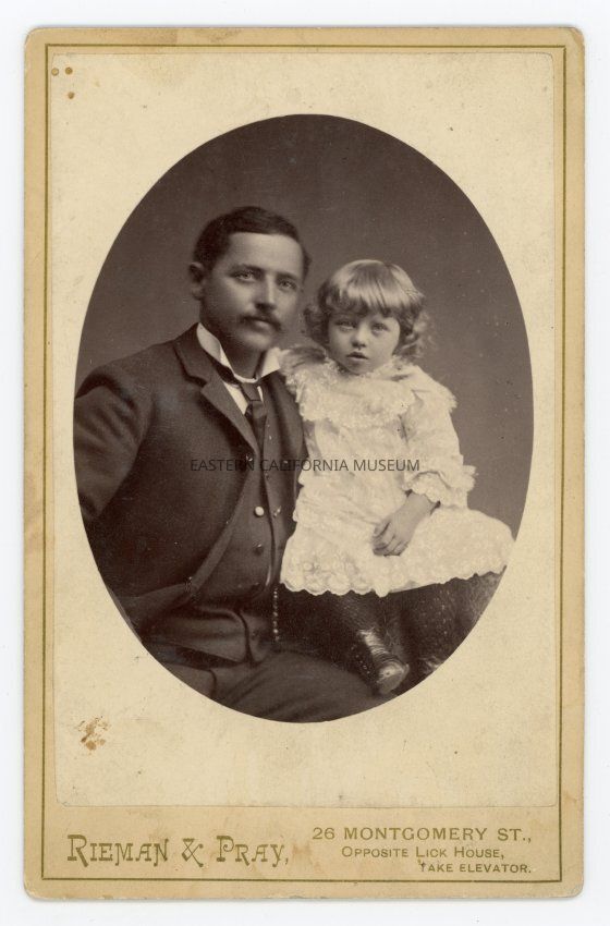 Mounted studio portrait of a man with a young child sitting on his lap. Photographer was Rieman and Pray of San Francisco.
