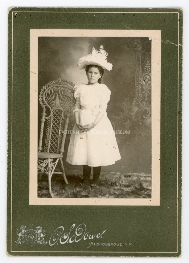 Mounted full length studio portrait of a young girl in a white dress and large white hat. Photographer was O.S. Dowe of Albuquerque, New Mexico.Collection