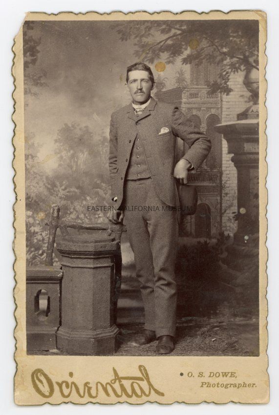 Mounted full length studio portrait of a man posing next to a balustrade and plinth. Photographer is O. S. Dowe, Oriental Studio [San Francisco?]. The edges of the mount are scalloped.Collection