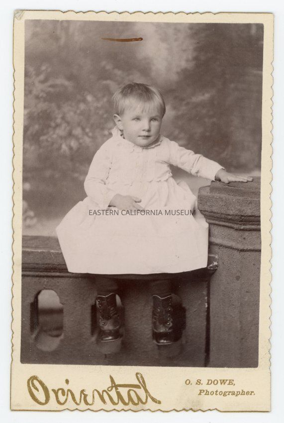 Mounted studio portrait of a young child in a white dress sitting on a balustrade and plinth. The edges of the mount are scalloped. Same photo as 1985.1.2.43.