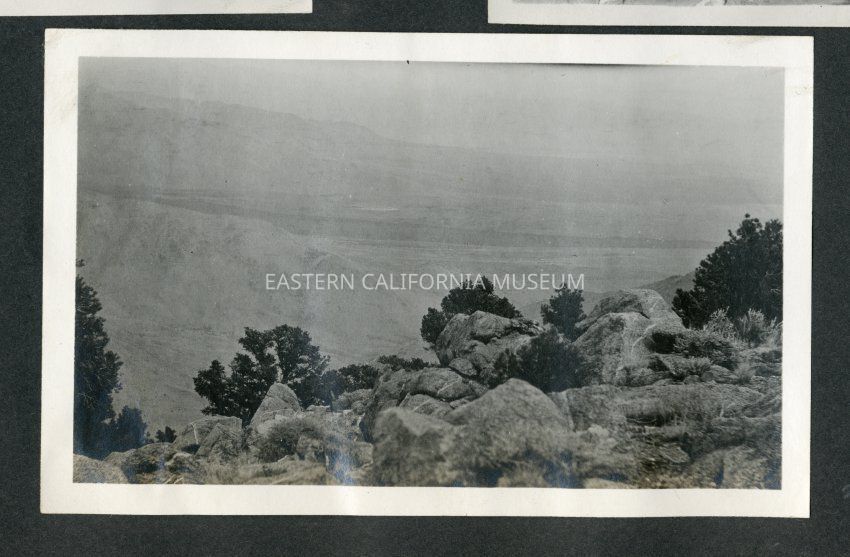 Landscape photo with boulders and shrubs in the foreground. Distance is hazy, dificult to discern anything.