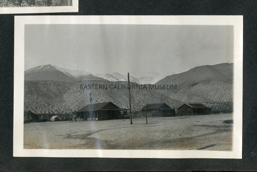 Photo of a Los Angeles Aqueduct work camp. Three buildings with two canvas tent cabins to the left. Snow-capped mountains in the distance.