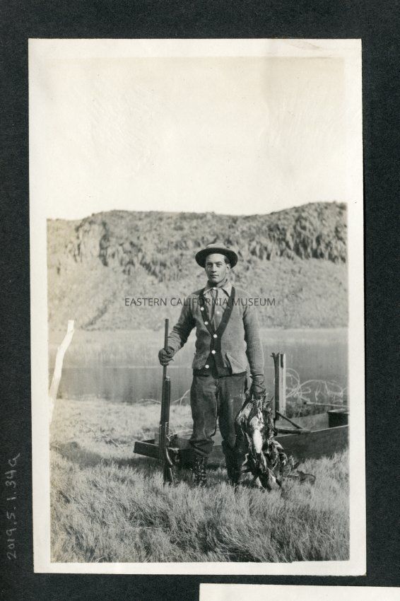Photo of a man holding the ducks or birds he hunted and a gun. He is standing in front of a shallow boat or skiff. There is water and a hill behind him, maybe Little Lake?
