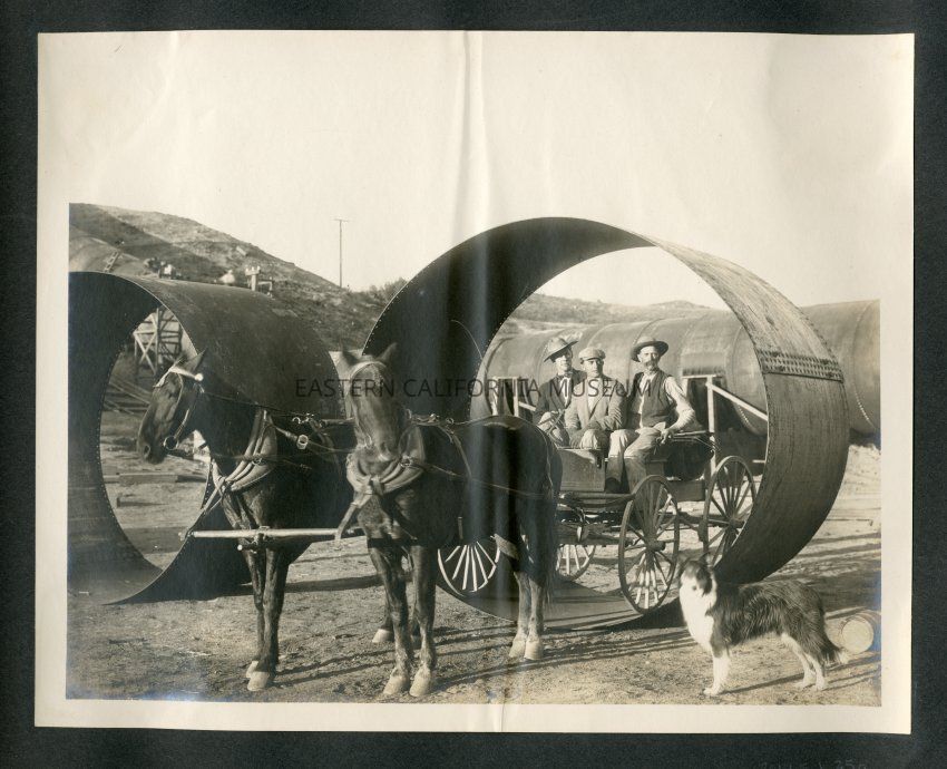 Photo of a horse drawn wagon driving through a section of siphon used in the constrution of the Los Angeles Aqueduct. There are three men sitting on the wagon and dog in the lower right side. More of the finished siphon visible in the background. Has "2881" written in the lower left side.