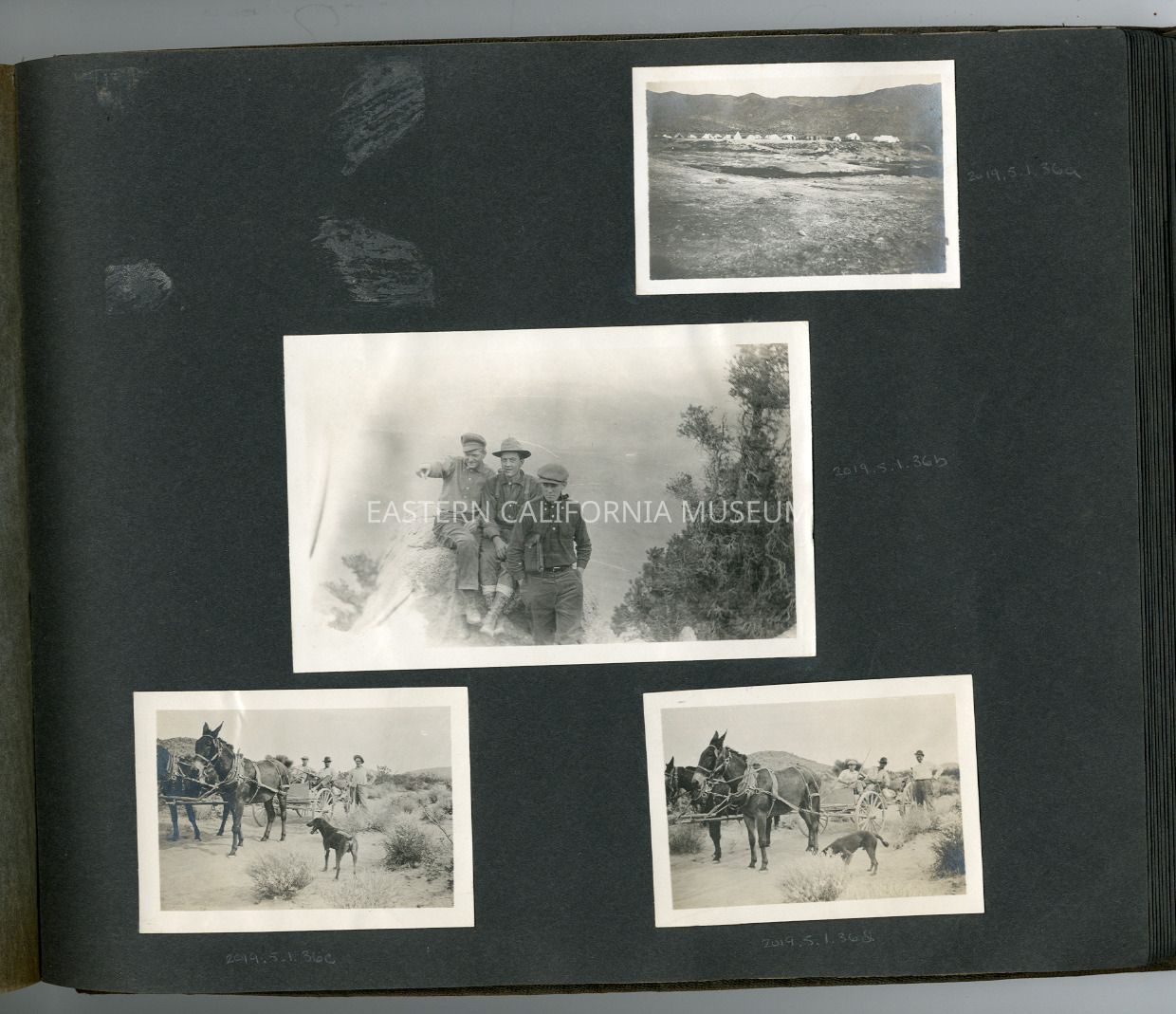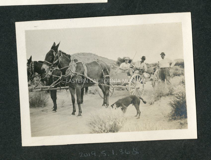 Photo of a horse-drawn wagon in what appears to be the Mojave Desert (yucca or joshua trees in background). There are two men on the wagon, one man standing beside it, and a dog in the foregorund. This photo was taken in the same place and time as 2019.5.1.36c.