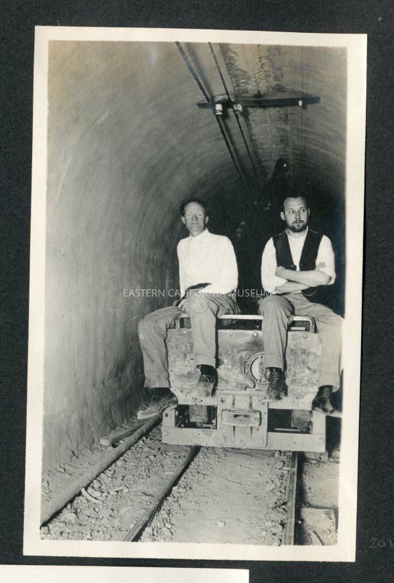 Photo of two men sitting on the little locomotive on railroad tracks inside a tunnel. The tunnel walls and ceiling are finished (not raw rock).