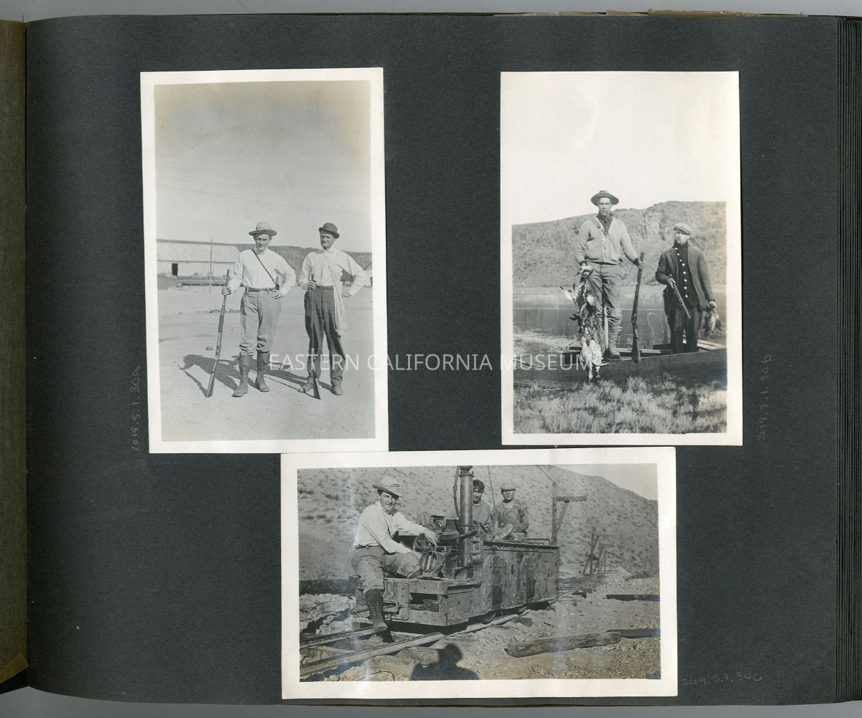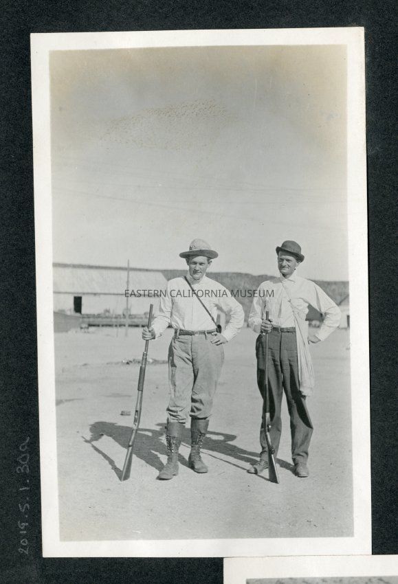 Photo of two men standing with guns. There is a structure behind them and maybe the side of a canvas tent cabin. The man on the left is also in photo 2019.5.1.30c.