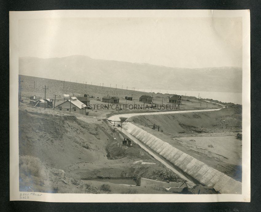 Photo of an open lined section of the Los Angeles Aqueduct and work camp with several buildings. May be Owens Lake in the background. Has "2361 Best" and "2362" written in pencil in lower left corner.